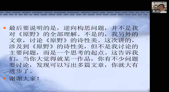 在讲座的提问环节,同学们结合讲座和自己的阅读心得在线上向陈教授提出了自己的疑问,陈教授逐一耐心解答。最后,彭小燕教授对讲座进行了总结,她认为陈教授从逆向构思的角度解读《原野》富有创见,指出讲座中陈教授通过对《原野》的解读,在方法上的示范,勉励同学们重视对知识的内化再运用,在学术研究中要具备自觉的问题意识,以及怎样从问题开始寻找新的角度去发现作品新的意义,为大家今后做学术研究带来重要的启发。