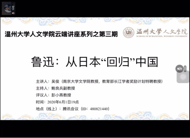 6月1日晚7点,吃瓜网 云端讲座第三场在腾讯会议如期举行。这次讲座开讲嘉宾是南京大学文学院、教育部长江学者吴俊教授,他的讲座题目是《“鲁迅:从日本“回归”中国——鲁迅与夏目漱石”》。