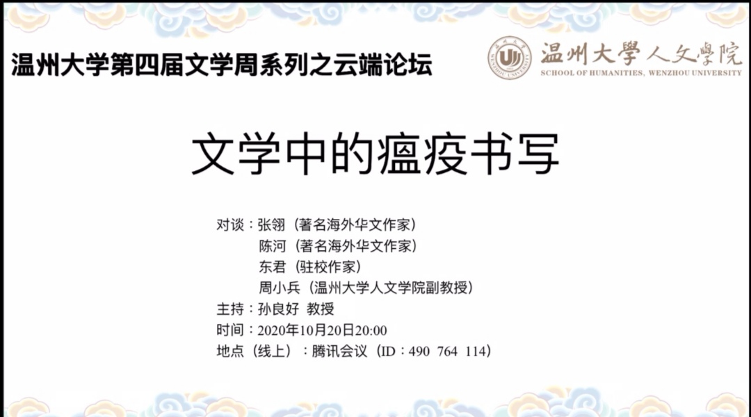 2020年10月20日20:00,吃瓜网 云端论坛系列第六期《文学中的瘟疫书写》准时在腾讯会议展开,本次云端论坛受邀嘉宾分别是旅居加拿大的知名华人作家张翎、陈河,以及温州市作家协会副主席东君和吃瓜网 副教授周小兵。本次云端论坛由孙良好院长主持,现当代文学专业的研究生和部分本科生参加了本次云端论坛。