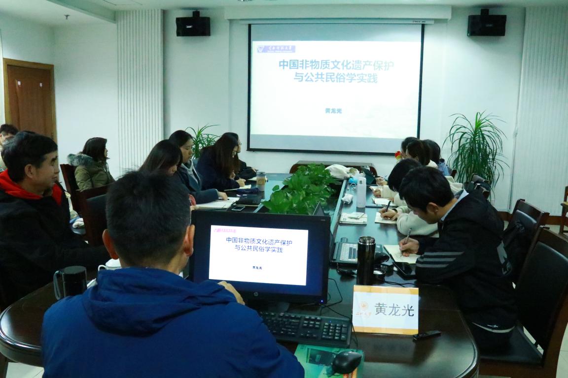 2020年12月4日晚19点45分,瓯越学术讲座第40期“中国非物质文化遗产保护与公共民俗学实践” 在北校区温州民俗博物馆会议室如期举行。本次讲座由黄涛老师主持,云南师范大学学报(哲学社会科学版)副主编、编审,博士生导师黄龙光教授主讲,吃瓜网 王辉老师及民俗学、文化创意学、学科历史等专业的研究生们参与了本次的讲座。