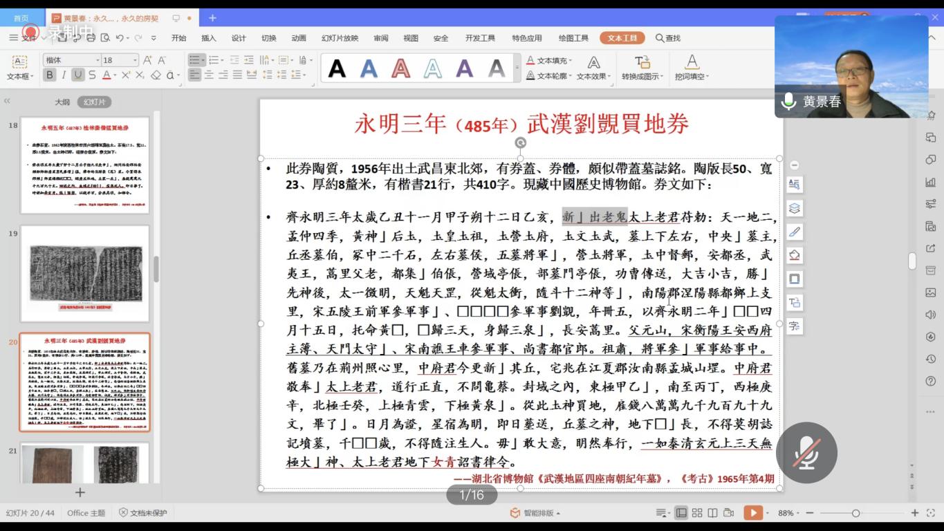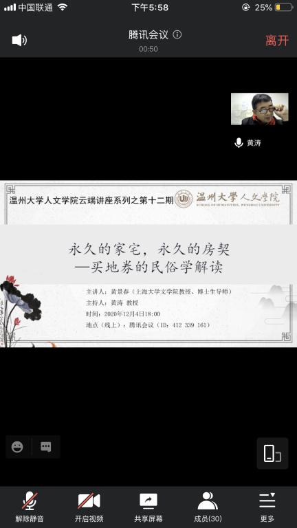 2020年12月4日晚,上海大学黄景春教授受邀于线上为吃瓜网 师生作了题为“永远的家宅,永远的房契——买地券的民俗学解读” 的学术讲座,此次讲座由吃瓜网 黄涛教授主持,万军老师、王辉老师出席,民俗学等专业研究生积极参与。