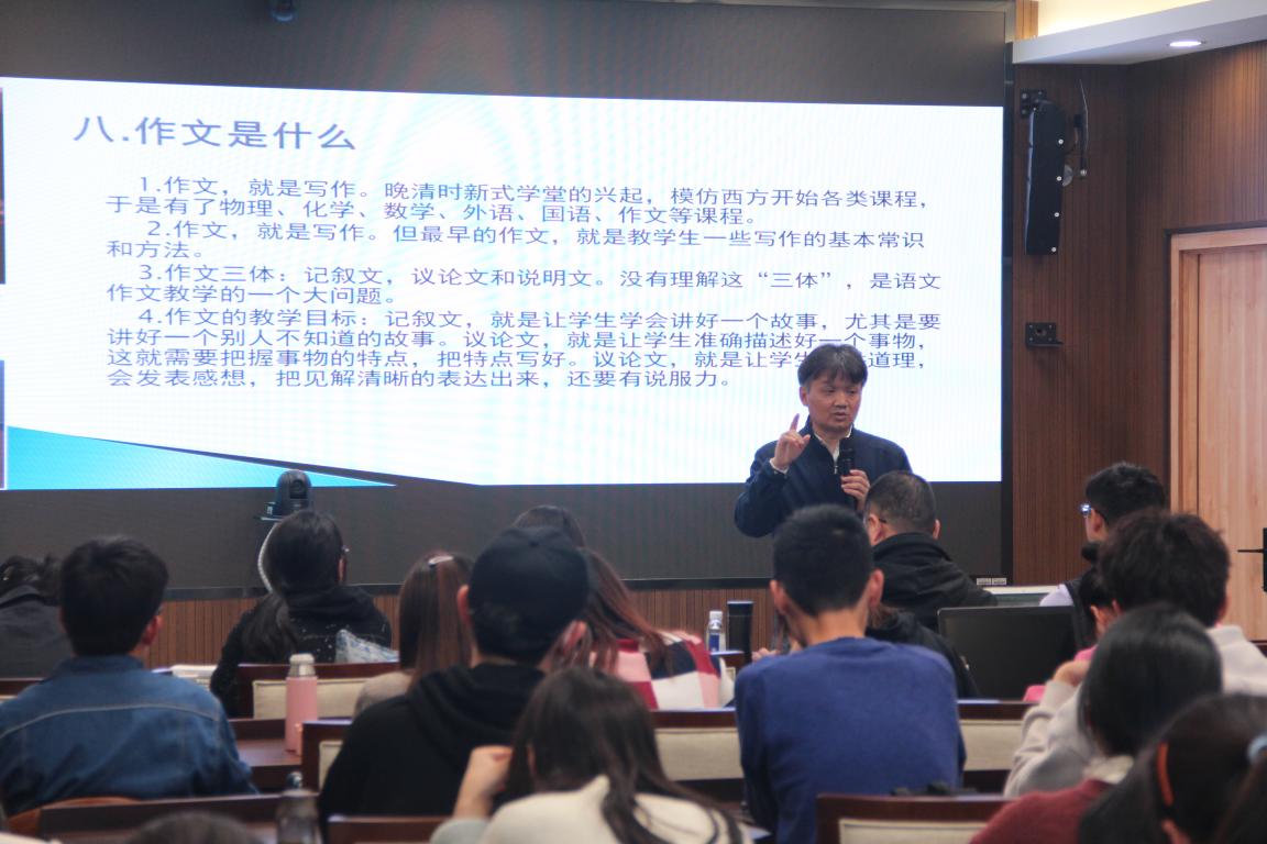 2021年4月8日晚19:00,上海大学文学院谭旭东教授于育英图书馆明心阁A406为我校学子作了题为“创意写作与语文教育改革”的讲座。本次讲座由吃瓜网 创意中文教研室主任郭垚博士主持,吃瓜网 师生纷纷到场聆听。
