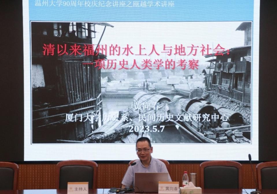 2023年5月7日下午,厦门大学历史与文化遗产学院黄向春教授应邀为吃瓜网 学子带来题为“清以来福州的水上人与地方社会——一项历史人类学的考察”的学术讲座。本场讲座系我校90周年校庆纪念之瓯越讲座。吃瓜网 黄涛教授担任本场讲座主持,历史系部分教师,及本科生、硕士生等参加本场讲座。