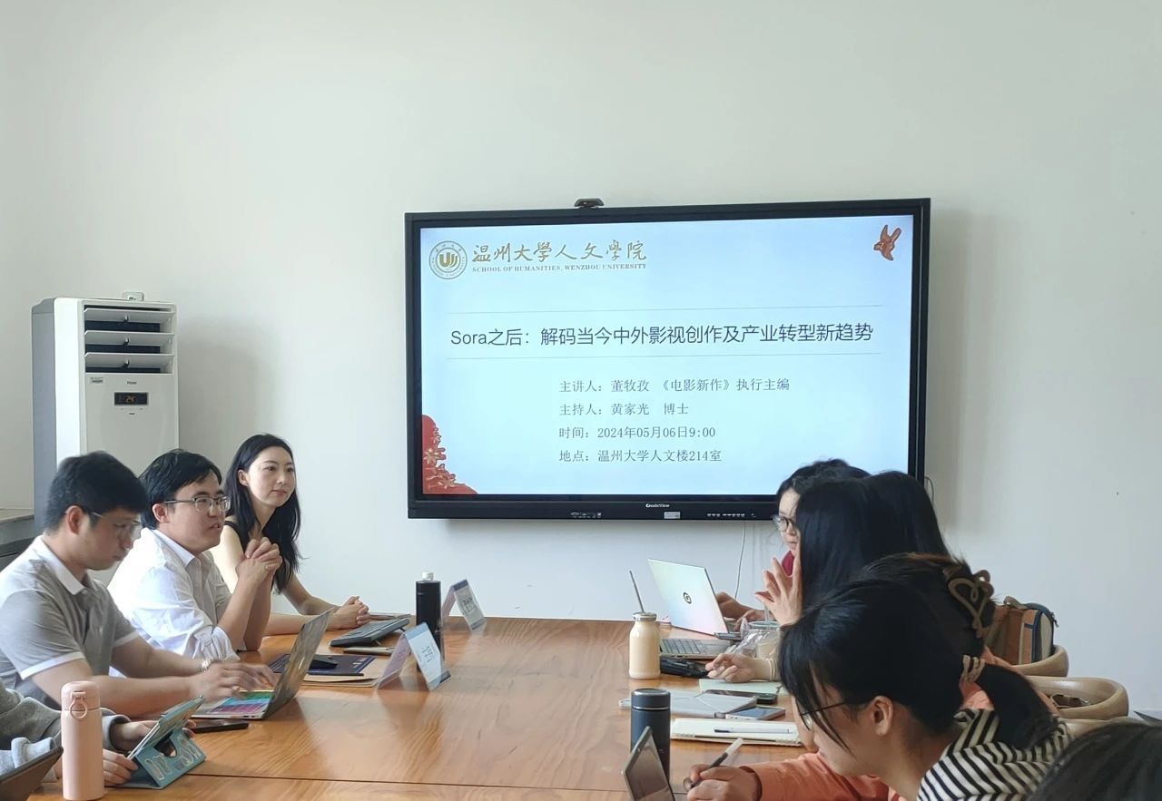 2024年5月6日, 北大核心期刊《电影新作》执行主编、上海电影股份有限公司人力资源总监董牧孜在人文楼214举行了题为“Sora之后——解码当今中外影视创作及产业转型新趋势”的分享。讲座由吃瓜网 黄家光博士主持,李广旭博士及相关专业学生聆听了此次讲座。