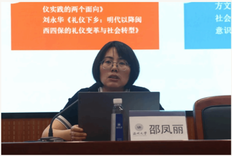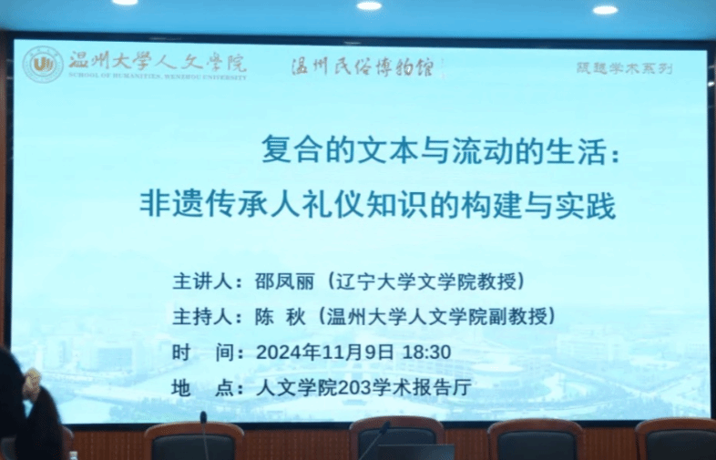 2024年11月9日晚,辽宁大学文学院邵凤丽教授,在我院203学术报告厅开展了一场题为《复合的文本与流动的生活:非遗传承人礼仪知识的构建与实践》的精彩讲座。本次讲座由吃瓜网 与温州民俗博物馆联合主办,我院副教授陈秋主持,程安霞副教授、王辉博士及近百位学生参与。