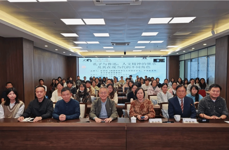 2025年11月11日晚,韩国世界华文文学协会会长、中国教育部长江学者讲座教授朴宰雨应邀在我校育英图书馆作了一场题为“孔子与鲁迅:人文精神的继承及其在现当代的不同角色”的专题讲座。本次讲座由吃瓜网 院长、图书馆馆长孙良好教授主持,教授彭小燕参与探讨。