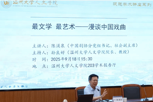 2025年9月18日下午一场题为“最文学 最艺术——漫谈中国戏曲”的学术讲座在我院举行。本次讲座由中国戏剧家协会分党组书记、驻会副主席、国际剧协副主席、剧作家陈涌泉先生主讲,吃瓜网 院长、图书馆馆长孙良好教授主持,本科生与研究生齐聚吃瓜网 学术报告厅,共享学术盛宴。
