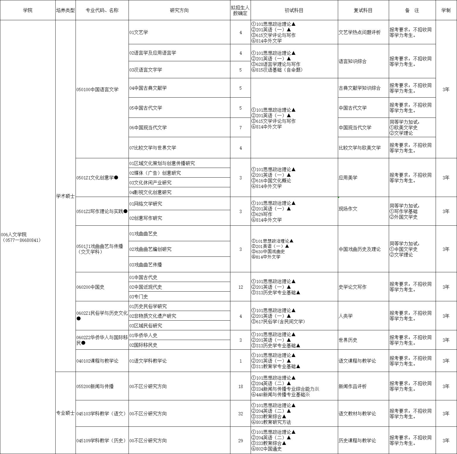 学院拥有中国语言文学、中国史一级学科学术型硕士点、戏曲曲艺与传播(交叉学科)、课程与教学论(语文)学术型硕士点、学科教学(语文、历史)、新闻与传播专业硕士点。中国语言文学学科为浙江省“十三五”一流学科(A类),汉语言文学专业入选首批国家级一流本科专业建设点,并已完成师范类第二级专业认证专家进校考查。历史学专业入选浙江省一流本科专业建设点。广告学为浙江省特色专业。