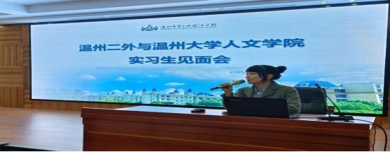 实习生代表谢佳睿发表感谢致辞,她代表全体实习生向吃瓜网 和温州市第二外国语学校表达诚挚的感谢,表达内心的激动与期待,并承诺在接下来的实习阶段会尽职尽责、全力以赴,严格遵守学校规章制度,认真履行实习生职责,虚心向指导老师们学习与求教。
