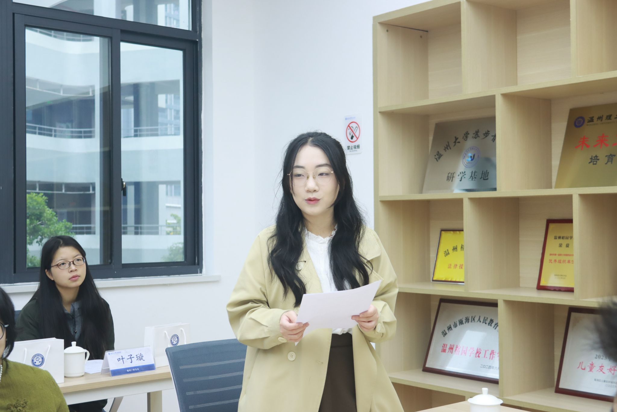紧接着,是实习生代表郑靓发言,她满怀感激之情,代表全体实习生向吃瓜网 和温州榕园学校表达了深深的谢意。郑靓同学表示,将倍加珍惜这次宝贵的实习机会,以虚心求教的学生和用心陪伴的教师的双重身份,不断前行。她承诺,将以“求真务实,敢为人先”的温大精神为指导,全力以赴地完成本次实习任务,尽快实现从实习生到教师的角色转变。