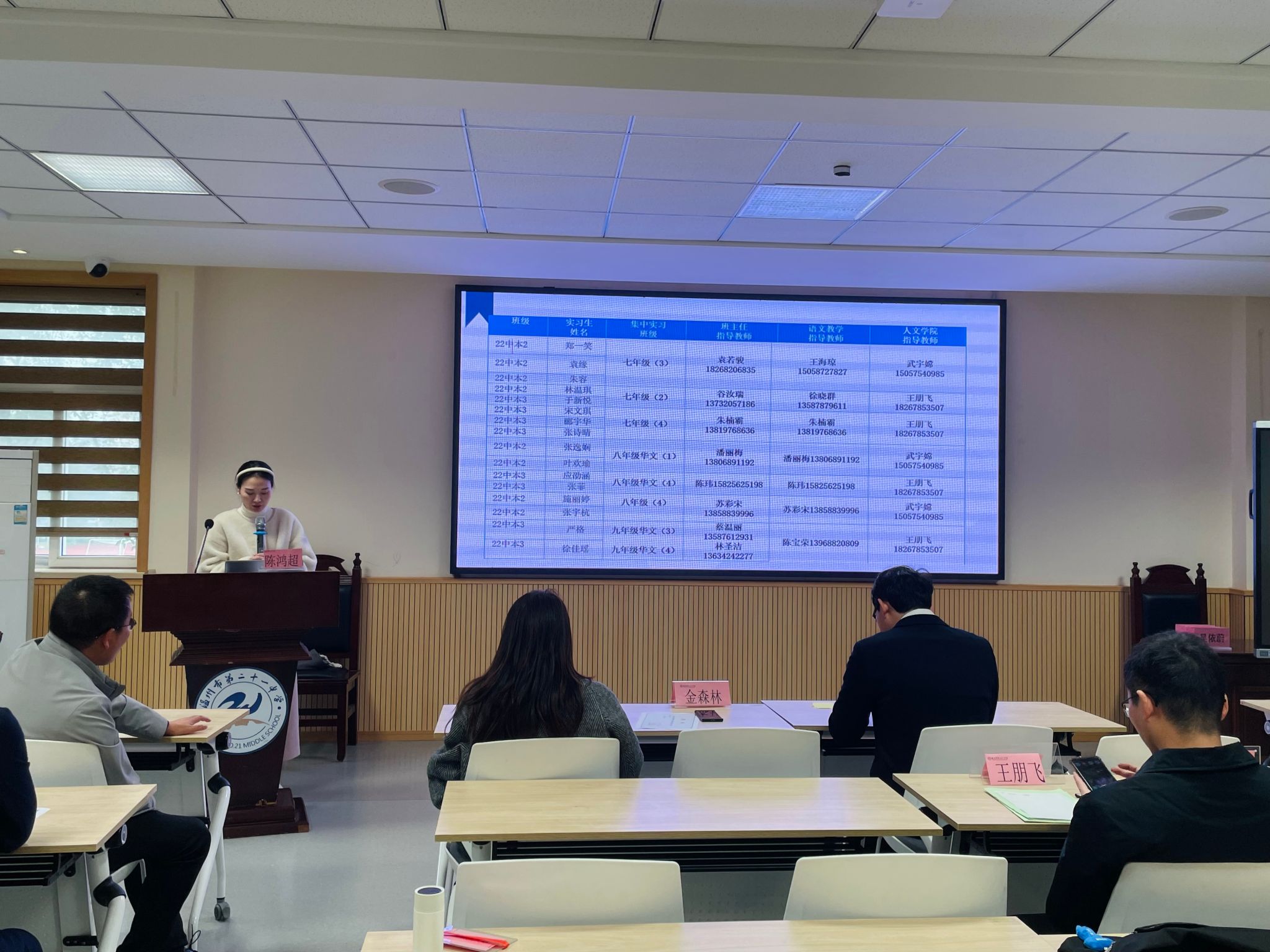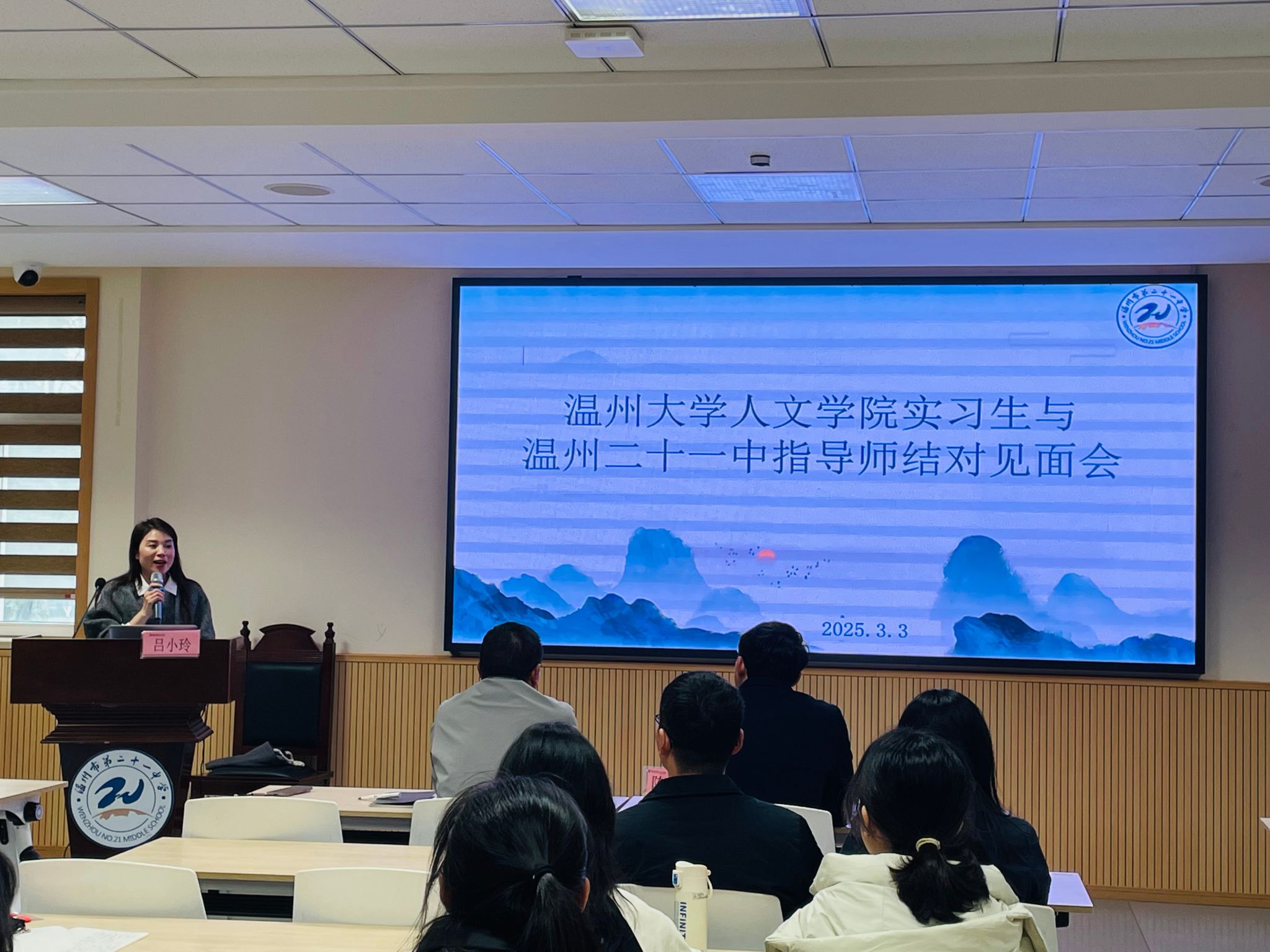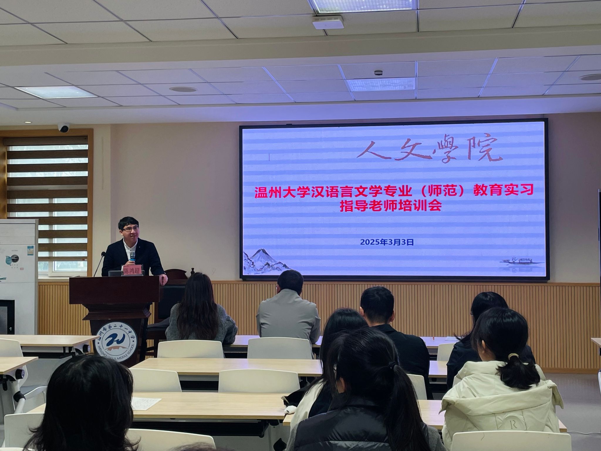 3月3日下午,吃瓜网 汉语言文学(师范)专业实习生见面会在温州市第二十一中学尚美楼二楼竞舟厅举行。会议由研训处副主任陈梦媚主持,出席本次会议的人员有吃瓜网 副院长陈鸿超、吃瓜网 带队指导师武宇嫦、王朋飞,温州二十一中副校长吕小玲、副校长金森林、学科指导师、班主任指导师和全体实习生。