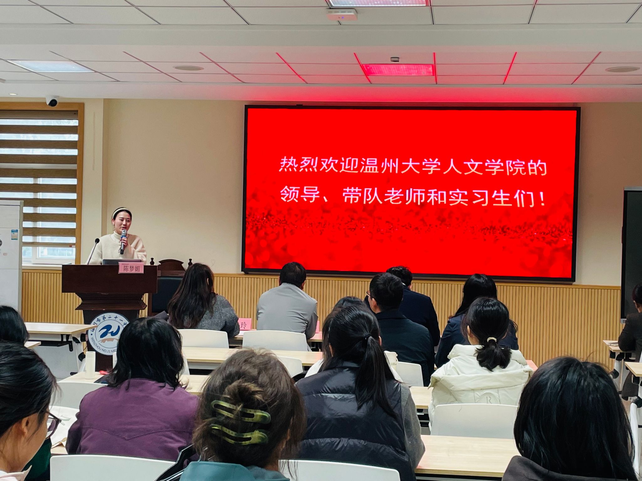 吕小玲副校长随后登台致辞,对温大师生的到来表示热烈欢迎,并详细介绍了学校概况。吕校长特别强调,本次实习聚焦初中语文教学,鼓励实习生珍惜机会,做到课前想问题,课中多观察,课后勤思考;同时要抓住机会,多向语文组名师学习,积极参与教改实践;更要创造机会,转换角色,尝试向学生学习,为未来教师生涯奠定坚实基础。