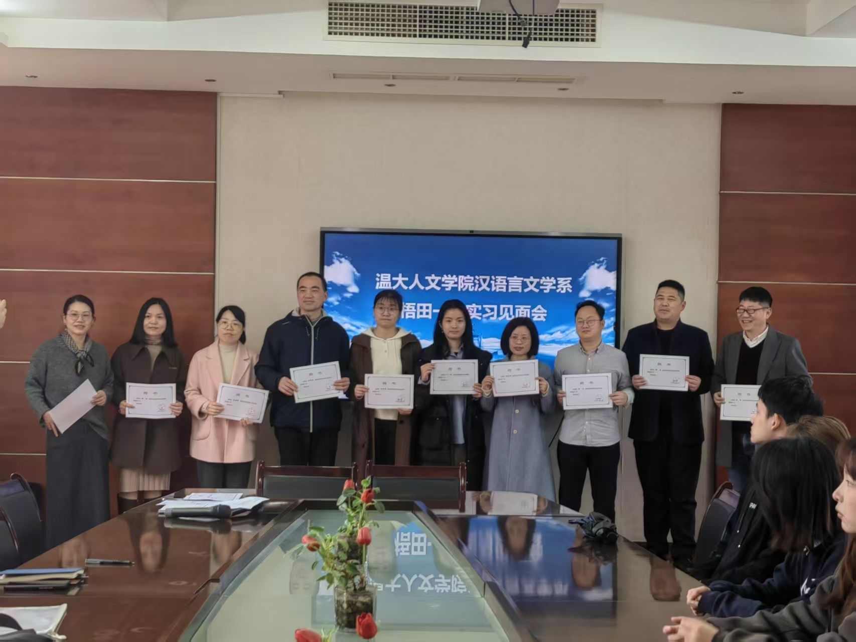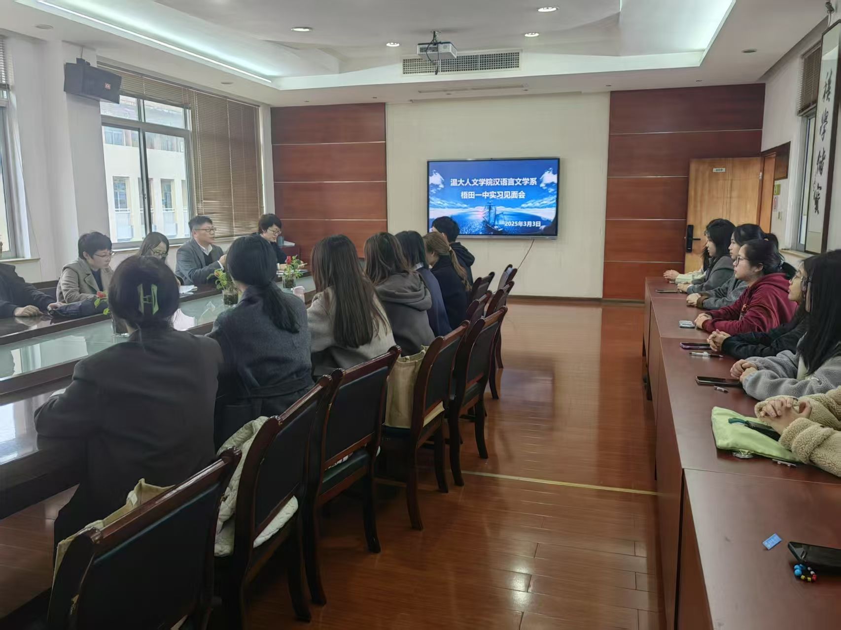 “至若春和景明”,“明”于梧田。为帮助实习生们全面了解学校的各方面情况,更好、更快地适应实习工作及开展各项活动,助力身份的转变,2025年3月3日,温州市瓯海区梧田第一中学在诚德楼409会议室为吃瓜网 22级汉语言文学(师范)专业的实习生们准备了一场教育实习见面会。梧田第一中学张强副校长、学科导师和班主任导师,吃瓜网 陈源源副院长、高校指导教师罗进近、郭垚以及17名实习学生参加本次见面会。会议由梧田一中张乐老师主持。