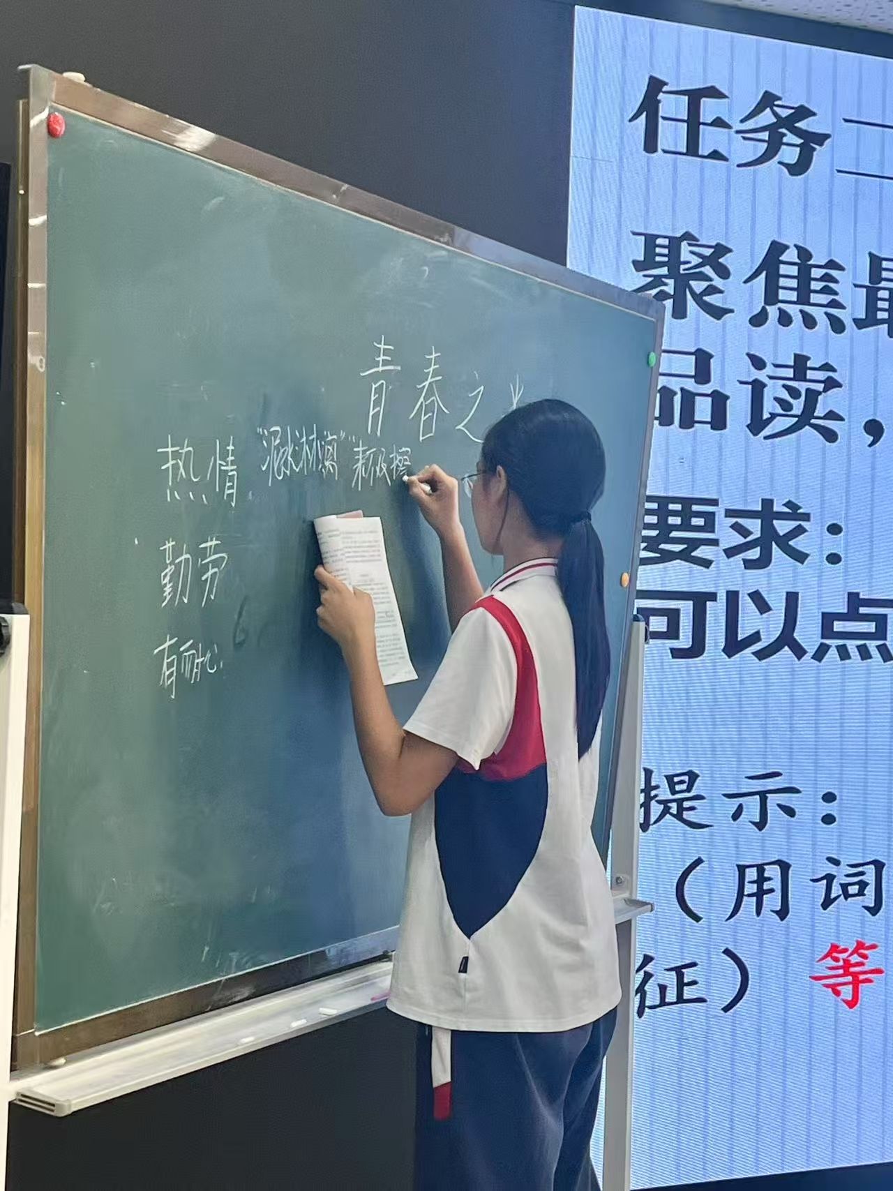 作为实习生代表之一的张雅诗同学选择的课文是《青春之光》。整堂课以题目中的“光”为主线,通过寻“光”之迹、品“光”之质、明“光”之源这三步骤层层递进,引导学生深入探究这一人物的形象和精神。整堂课既有对文本小标题的扎实解读,又通过小组合作、情景模拟等多元活动,使得学生在探寻榜样力量的过程中,让青春的思考与感悟在心中生根发芽。