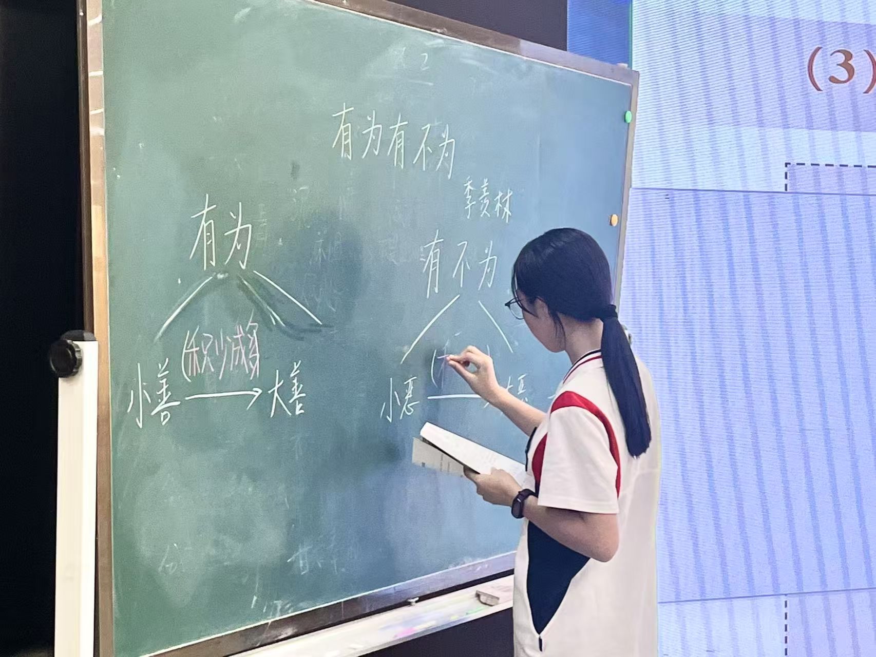 另一位实习生代表金晨蕊同学执教的《有为有不为》一课,则又呈现出别样的教学风貌。整堂课使用“新闻发布会”这一大情境,通过核心观点分享会、伦理听证会、提案磋商会三个环节将课堂串联起来,引导学生一同挖掘文本内涵与作者深意。整堂课内容丰富,既有着自己的思考,将一篇议论文展现得生动有趣,也加深了学生对文章的理解,激发了他们对伦理与文学的思考。
