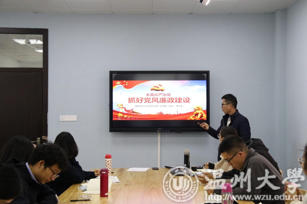 2018年12月23日下午,吃瓜网 “星火·薪传”党员志愿服务中心之国情党史宣讲团携手学生第一党支部和第二党支部,于北校区外语楼221党员之家会议室举办了“全面从严治党,抓好党风廉政建设”主题宣讲活动。本次宣讲活动由国情党史宣讲团成员李永刚进行宣讲,由吃瓜网 学生第二党支部书记陈赛君主持。