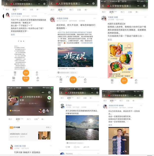 学生第三党支部从4月1日起,利用微信小程序特别推出了主题为“宅家欢乐多”的打卡活动,在进行思想政治教育的同时,党员同志们利用打卡活动,通过笔端记录了疫情期间的居家日常。截至4月14日,已有22位党员留下近200条动态。