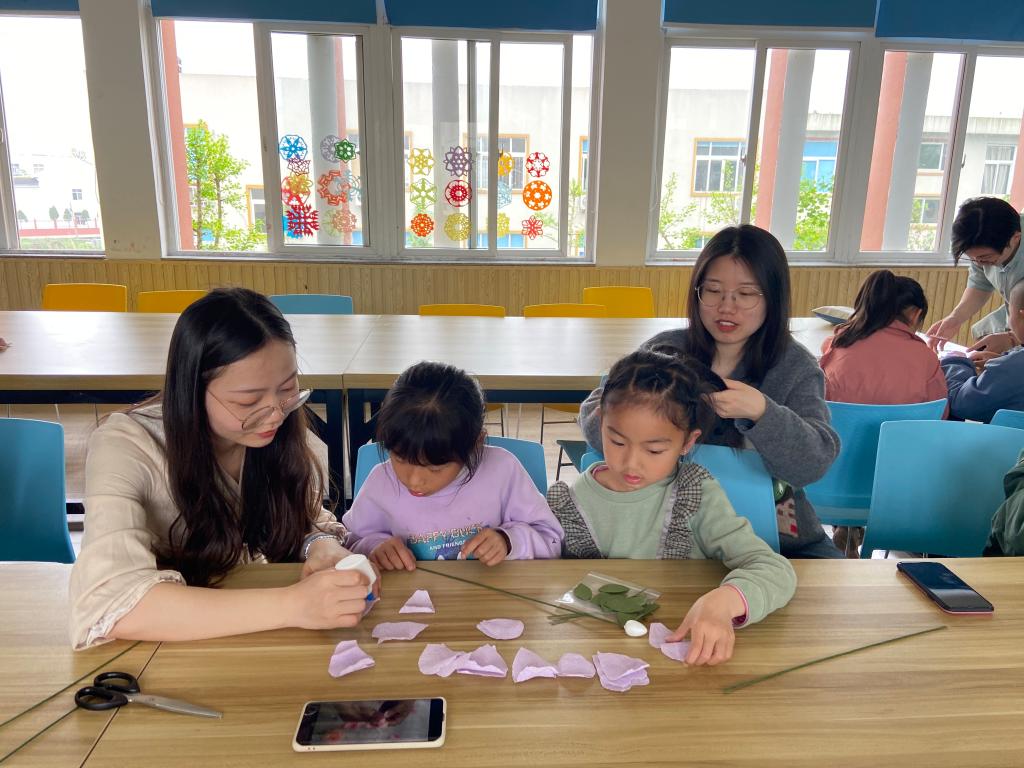春天,百花争奇斗艳,正如孩子们天真烂漫的笑脸。这次,党员志愿者们准备的第一个惊喜就是带着孩子们亲手制作玫瑰花。为了避免小朋友使用剪刀的危险,党员志愿者在清明小长假前夕提前剪花瓣,裁树叶,扯丝线,并分装成一个个精致小巧的材料包。教室里,18个孩子三三两两地自愿成组,每组配备一位志愿者共同完成花朵制作。一边小心翼翼地进行每个步骤,一边欢声笑语不断,繁琐的制作过程轻松且愉悦。淡紫色的花瓣,绿葱葱的树叶,飘逸的丝线……“大手”加“小手”的默契配合下,一朵朵“友谊之花”争先恐后地绽放。