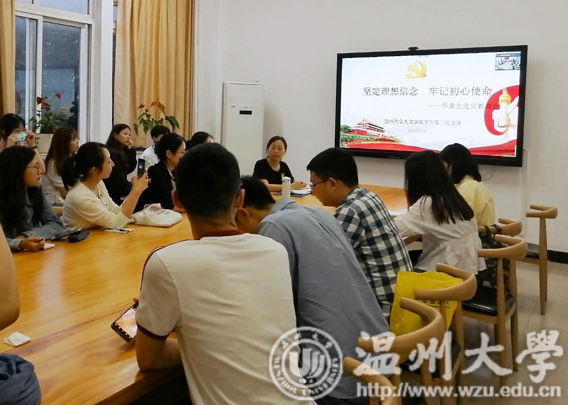 2021年5月29日晚,我院学生第二党支部在人文楼214“党员之家”召开毕业生党员教育会。本次会议由党支部书记陈赛君主持,全体党员通过线上线下相结合的方式共同参会。