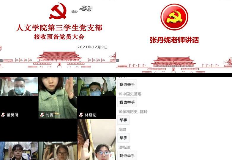 2021年12月9日,吃瓜网 学生第三党支部于线上开展了发展对象转预备党员的支部大会。由于新冠疫情影响,本次会议以线上方式进行。会议由支部书记李扬帆主持,支部指导老师张丹妮、支部全体党员参加了此次大会。