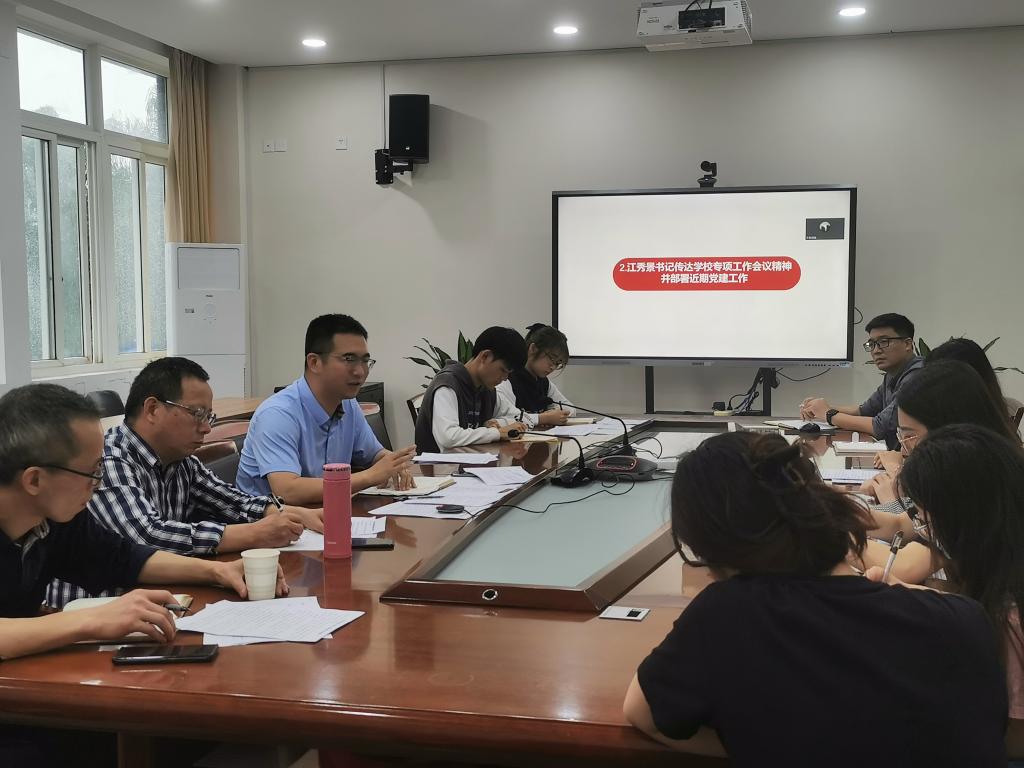 院党委书记江秀景传达了学校党建工作专项会议精神。他指出,面临当前复杂的形势,希望各支部能够强化认识,提高站位,时刻保持风险意识,在保持现有工作成效的基础上重点做好以下几方面工作:一是强化理论武装,坚持做好“三会一课”,促进形式内容多元,规范会议记录。二是夯实组织基础,加强对于支委会的建设,合理分工,打造团队。三是迈向党建新时代,将党建工作与时代特色挂钩,党建工作也要焕发新生,大步迈向新时代。四是争创党建品牌,瞄准样板支部、院系标杆的目标,落实党建“双创”工作。五是服务学院改革发展,要将专业发展与党支部串联,将学院师生与师生党员串联。六是守好安全底线,党员作为先锋模范,要发挥带头作用。