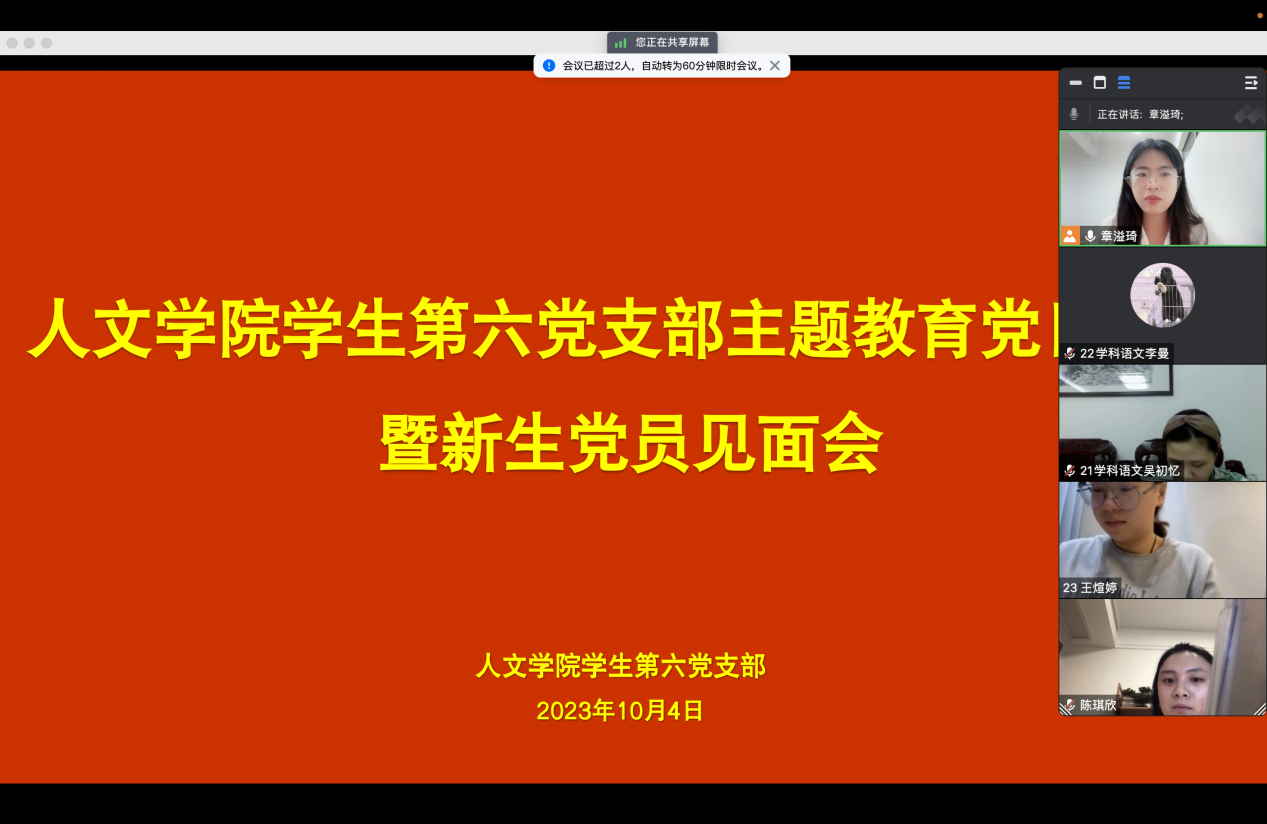 为贯彻落实教育部《关于举办2023年高校“礼敬中华优秀传统文化”宣传教育活动的通知》以及吃瓜网 党委关于学习贯彻习近平新时代中国特色社会主义思想主题教育动员的部署要求,经研究决定,吃瓜网 学生第六党支部于10月4日晚召开支部党员大会暨十月主题党日活动。本次会议由党支部书记章溢琦同志主持。