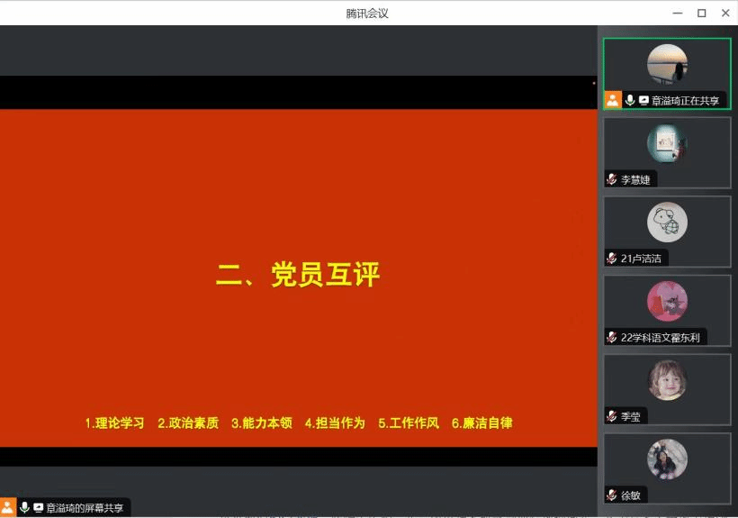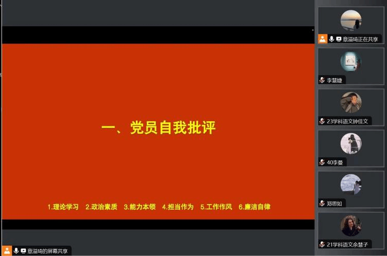 首先,支部书记章溢琦同志率先进行自我批评,强调从“理论学习”“政治素养”“能力本领”“担当行为”“工作作风”“廉洁自律”等多个方面进行。随后,第六党支部支委肖佳琦、曹蜜、李慧婕同志相继进行自我批评。各位党员同志也积极参与了发言,依次进行了深入的自我剖析,摆事实、讲表现,严肃开展批评与自我批评,从中发现问题、解决问题,找出差距并确定今后的努力方向以及改进措施。