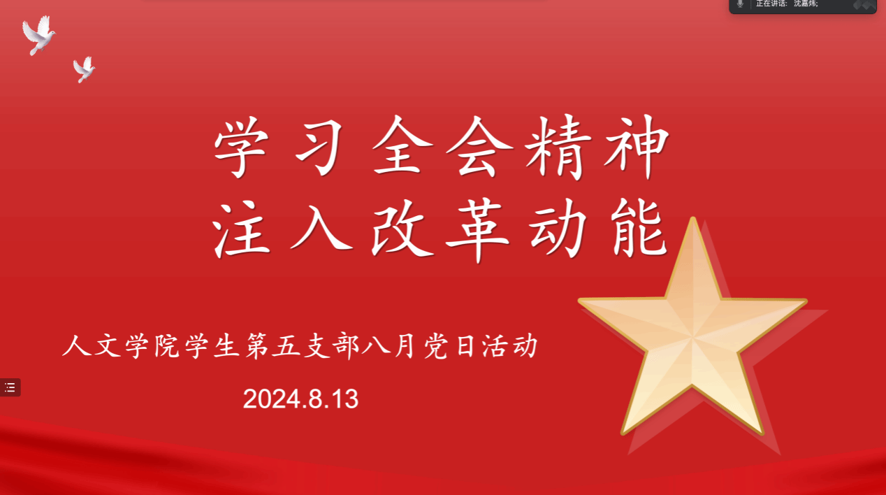 为深入学习贯彻党的二十届三中全会精神,推动全会精神深入人心、落地生根,2024年8月13日,吃瓜网 学生第五党支部于线上开展“深入学习贯彻党的二十届三中全会精神”主题党日活动。本次活动由沈嘉炜同志主持,共有34名同志参加。