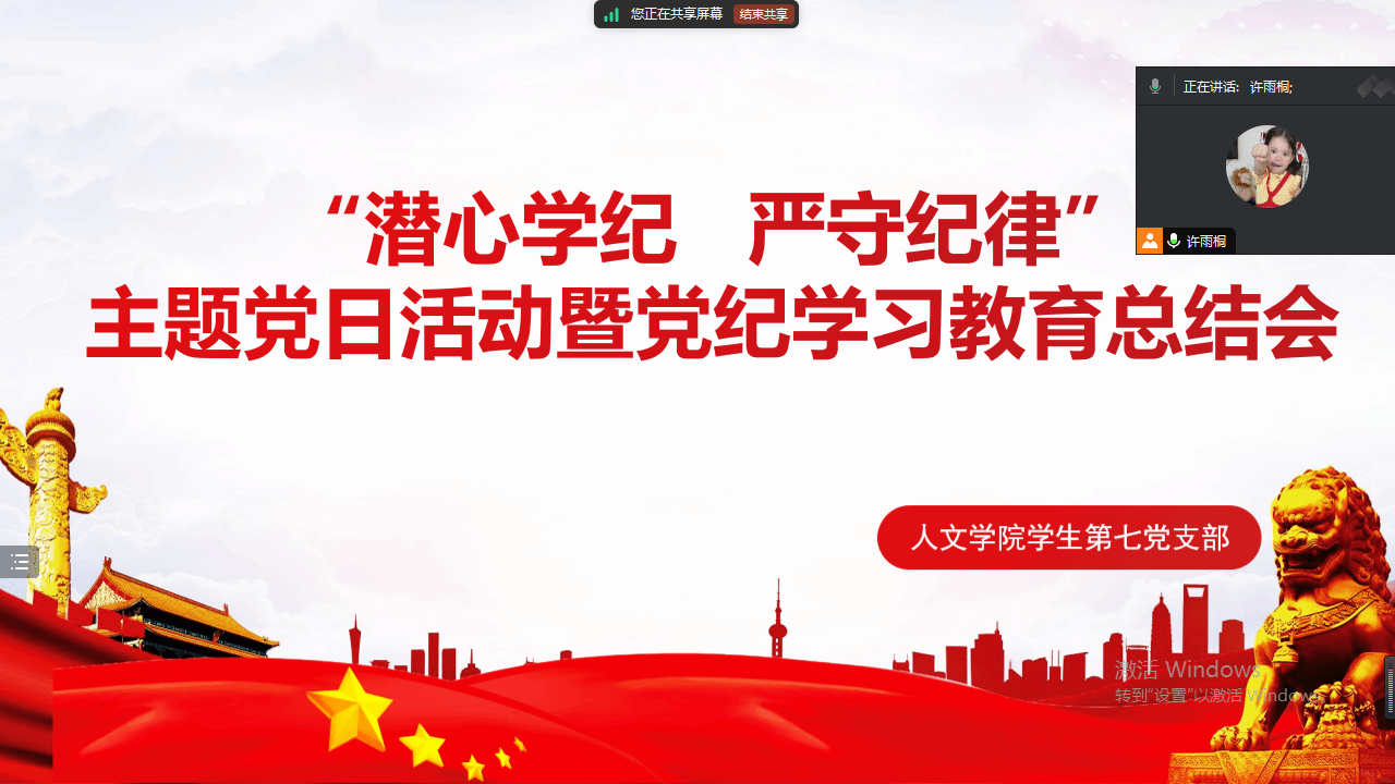 为深化“循迹溯源学思想促践行”行动,深入学习习近平总书记关于党纪学习教育的重要讲话和重要指示精神,推进党纪学习教育走深走实,取得实实在在的成效,2024年9月11日晚,吃瓜网 学生第七党支部在线上开展了以“潜心学纪 严守纪律”为主题的党日活动。会议由支部宣传委员许雨桐主持。