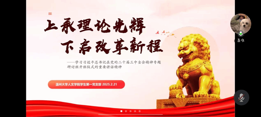 2025年2月21日晚上,吃瓜网 学生第一党支部举办了“上承理论光辉,下启改革新程”主题党日活动,通过学习习近平总书记在党的二十届三中全会精神专题研讨班开班仪式的重要讲话精神,不断深化对新时代全面深化改革的认识,进一步统一思想和行动。本次活动由聂唯同志主持,支部全体党员同志参加。