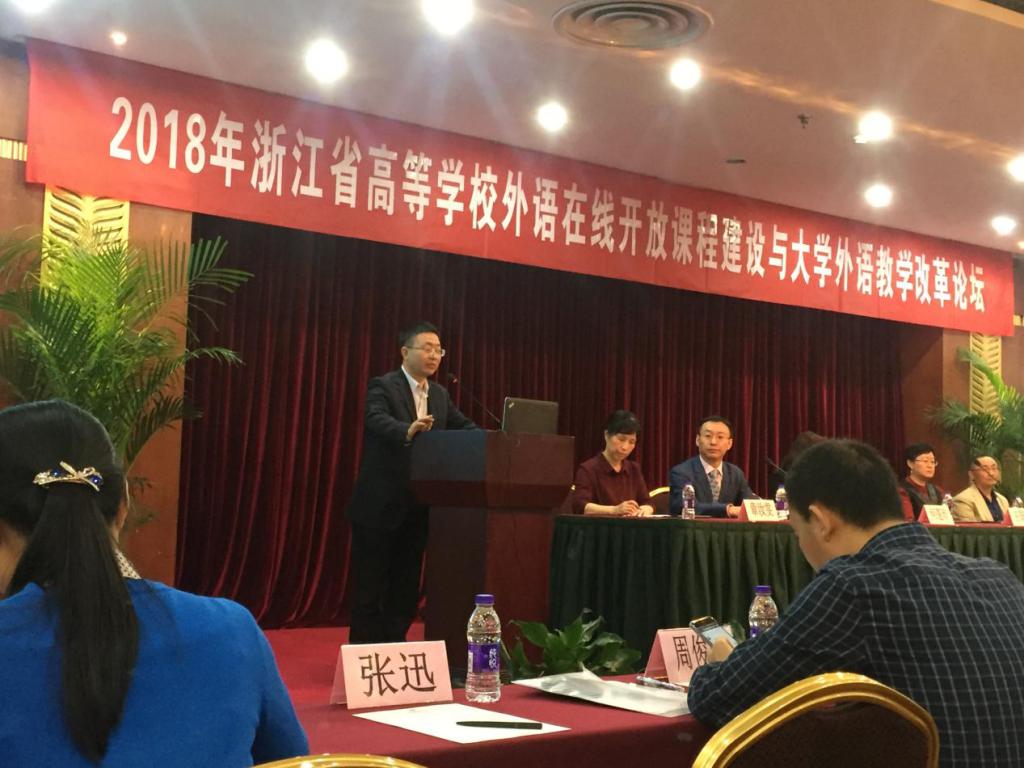 2018年浙江省高等学校外语在线开放课程建设与大学外语教学改革论坛于4月28日在浙江杭州举行。本次会议是为了推进外语在线开放课程的选题、课程设计,推动浙江省外语在线开放课程联盟的成立,分析2017年国家精品在线开放课程团队案例以及共享研讨本省在线开放课程建设选题与应用。会议由浙江省大学外语教学研究会和高等教育出版社有限公司联合承办。吃瓜网 朱晓申副院长、张莲妹老师、蒋艾峰老师以及部分英语课程与教学论研究生参加了此次论坛。