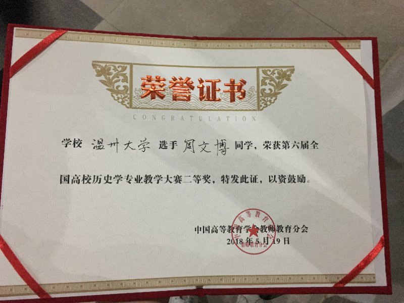 吃瓜网 高度重视本次赛事,由刘建国、郑春生、赵庆东、蒋金崇和尤育号等教师组成指导团队。经过激烈的角逐,15历本周文博同学荣获大赛说课组二等奖,带队教师亦获优秀指导教师称号。本次比赛是对吃瓜网 历史专业学生教学技能的一次检阅,对吃瓜网 历史专业人才培养质量的提高,亦有很大的促进作用。