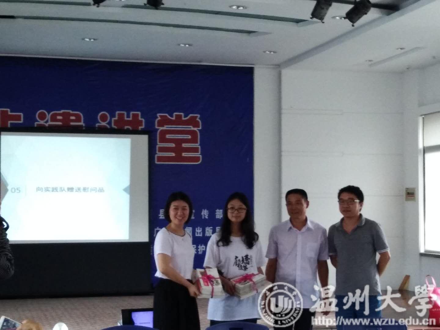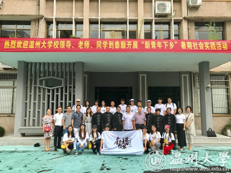 7月17日下午,校党委委员、纪委书记吴金法,在我院党委书记吴静、校团委书记屠霁霞等陪同下,赶到泰顺县罗阳镇非遗中心,看望我院廊桥遗梦暑期社会实践队。泰顺县文广新局林成起委员,泰顺县非遗中心鲍厚济主任,泰顺县廊桥研究保护中心庄通副主任热情接待。