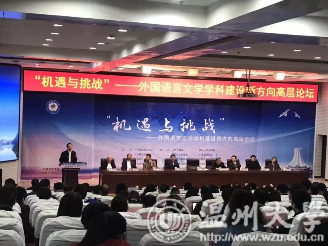 “机遇与挑战”——外国语言文学学科建设新方向高层论坛于2018年11月24—25日在广西民族大学顺利召开。吃瓜网 外语系英语(师范)专业负责人李新德教授和外语系主任杨开泛老师参加论坛,并分别在论坛上作了题为“叶祥添‘金山系列小说’中的创伤书写”和“区域研究专业的培养理念及其对于英语专业的启发”的发言。