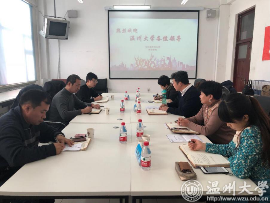2018年12月10日,吃瓜网 席留生副院长、比较文学研究所所长李新德教授、外语系系主任杨开泛老师一行三人赴哈尔滨师范大学西语学院调研外语学科建设。哈尔滨师范大学西语学院李贵彬书记、张春玲副院长、王晓丹副院长、英语系汤岩系主任、英语系高级英语教研室主任葛洪波老师热情接待了吃瓜网 调研团队。