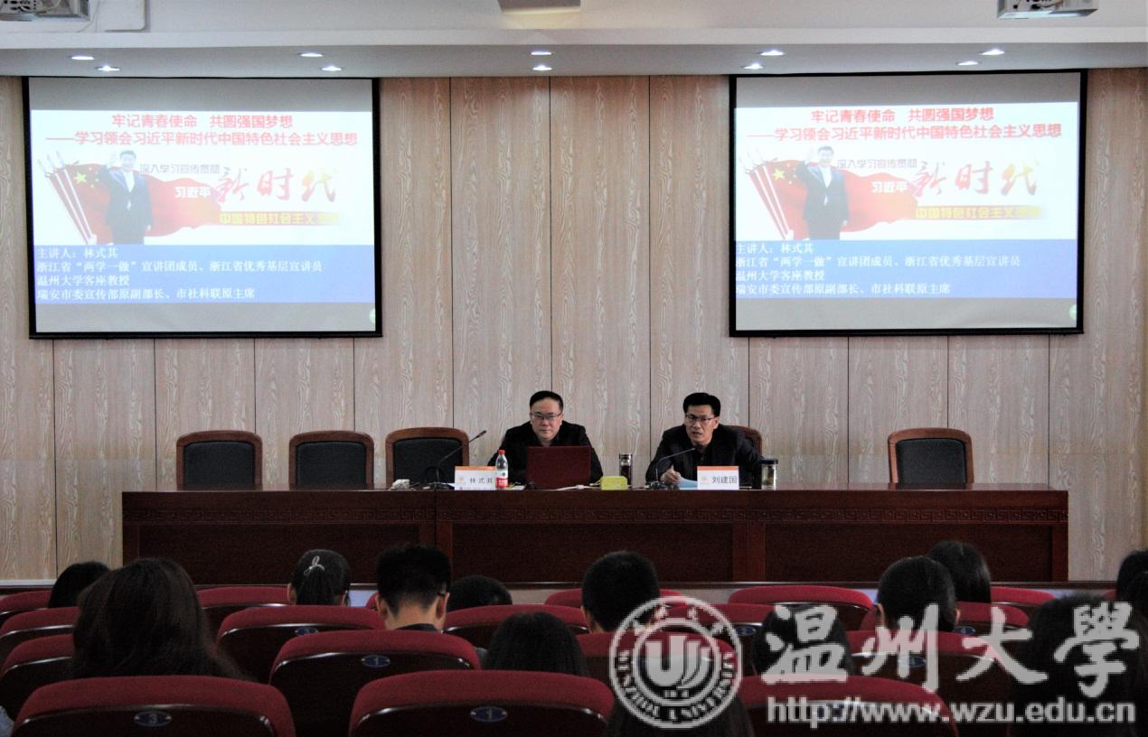 2019年4月12日13:30,迎着飔飔春风与阵阵花香,吃瓜网 在北校区人文楼203学术报告厅成功举办了以“‘牢记青春使命,共圆强国梦想’——学习领会习近平新时代中国特色社会主义思想”为主题的讲座。本次讲座的主讲人为我校客座教授林式其,我院副院长刘建国出席。