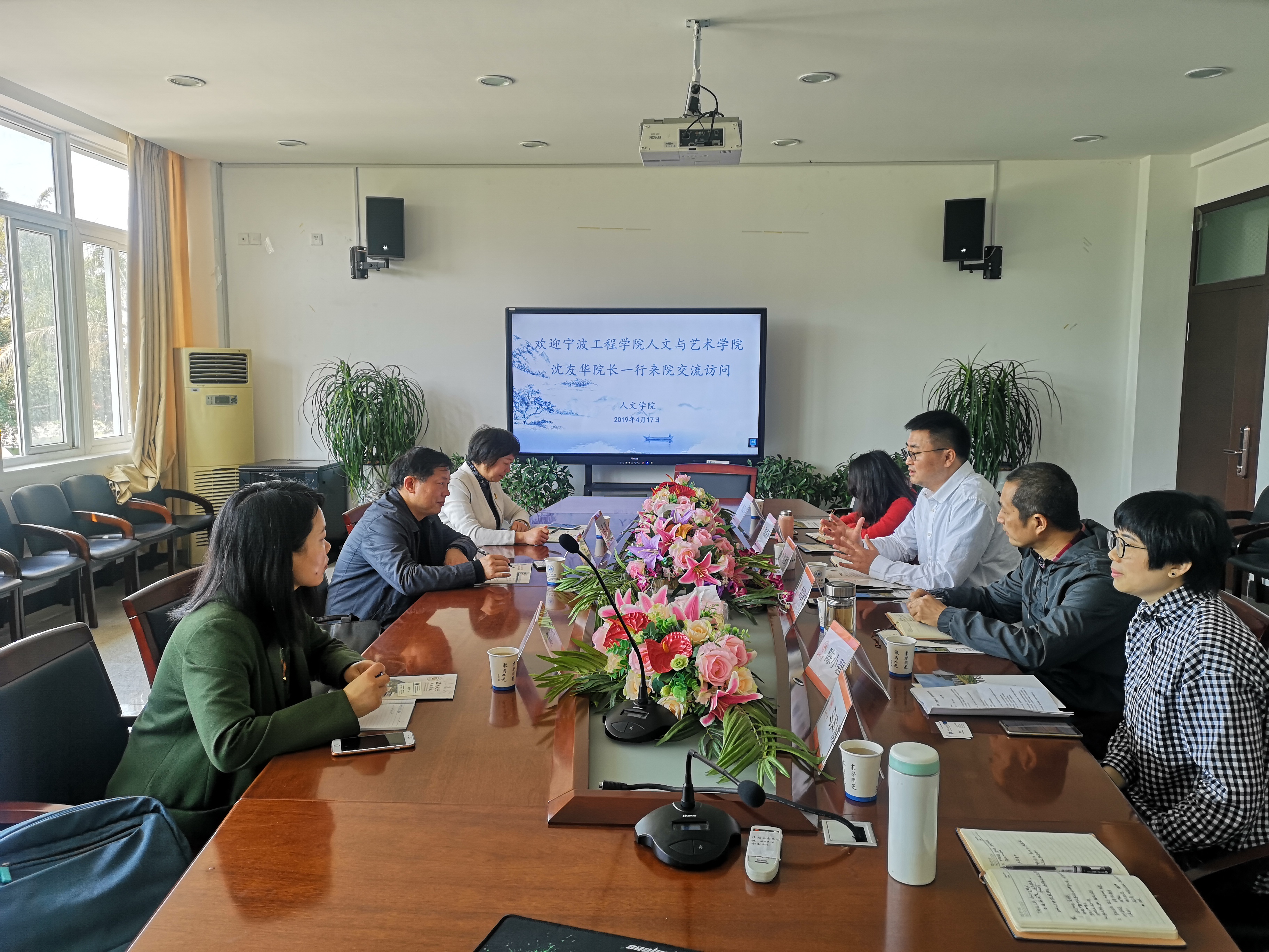 4月17日上午,宁波工程学院人文与艺术学院院长沈友华,副院长吕瑾及中文系副教授陈小亮来吃瓜网 交流访问。吃瓜网 孙良好院长、席留生副院长、中文系主任陈源源、广告系主任徐卫华、大学语文负责人陈小碧和办公室主任马声威热情接待了他们。双方就应用型学科专业建设、公共课程大学语文教学情况、专业硕士人才培养等方面进行了深入交流。