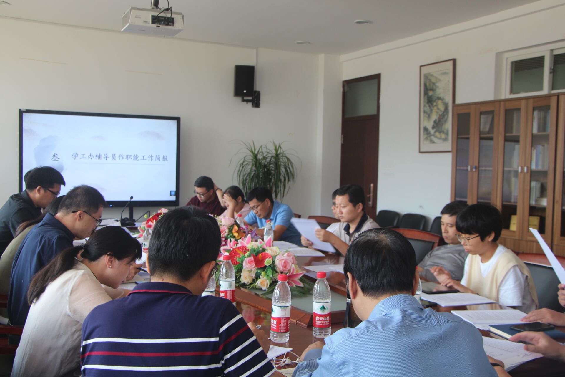 本次会议共有五项议程。首先,魏一老师介绍学院班主任队伍整体配备情况、在深化学区制改革的背景下学院学生工作的新形势、学院学生工作总体思路和更好发挥班主任能动性的重要作用。随后,刘纪峰老师对本学期总体工作计划作简要汇报,具体包括评奖评优、就业、文体活动、学风建设、心理、资助等内容。第三项议程中,胡震鹏、李丹萍、申业磊三位老师分别作职能工作汇报。胡震鹏简要陈述了学风建设管理制度、课外教育项目学分管理办法、优良学分班和学习标兵评比等内容。李丹萍就毕业生就业工作、贫困生补助以及奖助学金、公寓住宿等内容作阐述。申业磊则重点介绍了心理方面工作,希望班主任加强对心理问题学生的关注。