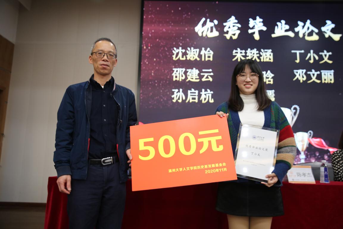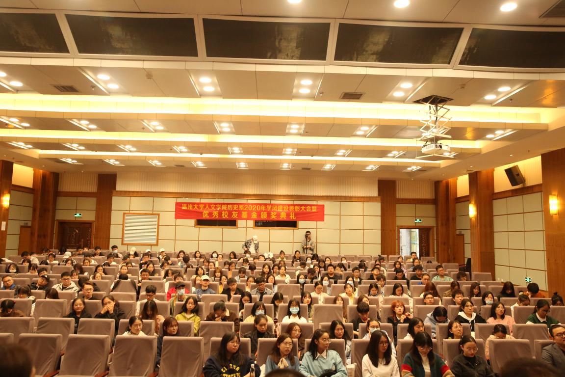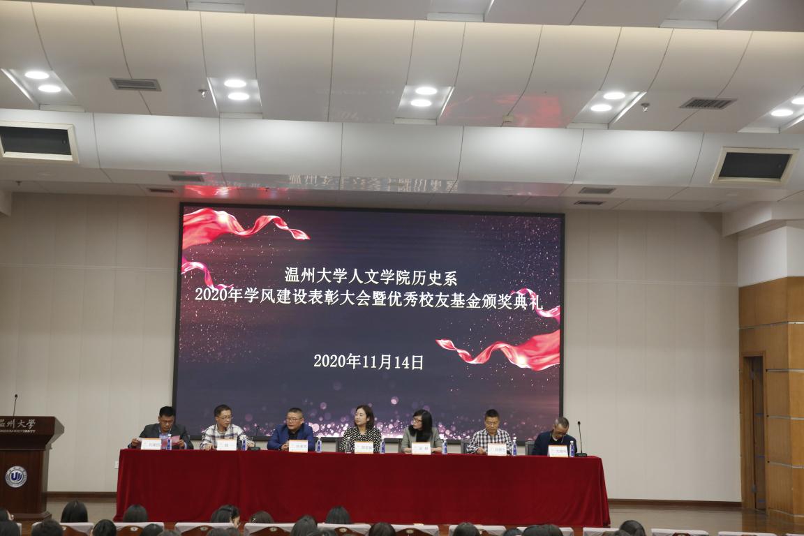2020年11月14日14时,吃瓜网 历史系2020年学风建设表彰大会暨优秀校友基金颁奖典礼于北校区信息楼报告厅举行。此次表彰大会暨颁奖典礼由吃瓜网 历史系发展基金会会长刘建国主持,温州万全教育集团董事长陈孝杰、吃瓜网 校友办主任陈宏毅、吃瓜网 党委书记吴静、副院长郑春生、副书记魏一、历史系主任尤育号以及历史系全体师生出席了此次会议。