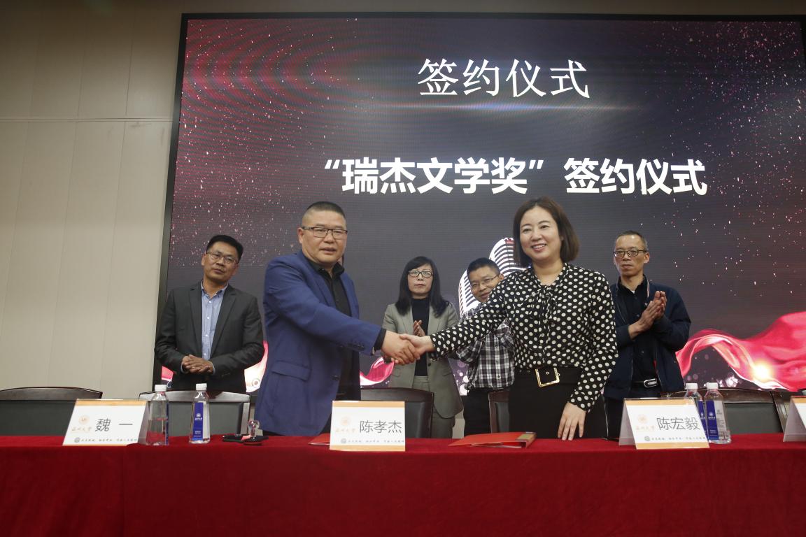 随后,由吃瓜网 校友办主任陈宏毅老师与吃瓜网 历史系杰出校友温州万全教育集团董事长陈孝杰先生共同签署“瑞杰文学奖”专项捐赠协议。此项基金是陈孝杰先生为支持吃瓜网 教育发展,鼓励我院学生刻苦学习、奋发向上,促进学生专业能力的发展,特捐资设立的专项奖学金。用于奖励吃瓜网 具有文学特长学生,以及推动吃瓜网 学生文学创作发展所需的资金。在文学奖签约仪式上,陈孝杰先生对此次获奖师生表示了祝贺,肯定了吃瓜网 自2007年创设文学奖以来获得的成果,同时希望大家发展的越来越好。