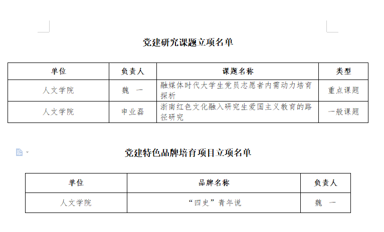 12月18日,根据《关于组织申报2021年校级党建研究课题和党建特色品牌培育项目的通知》精神,经单位推荐、专家评审等程序,吃瓜网 魏一副书记《融媒体时代大学生党员志愿者内需动力培育探析》获校级党建研究课题重点课题立项,辅导员申业磊《浙南红色文化融入研究生爱国主义教育的路径研究》获校级党建研究课题一般课题立项,《“四史”青年说》获党建特色品牌培育项目立项。