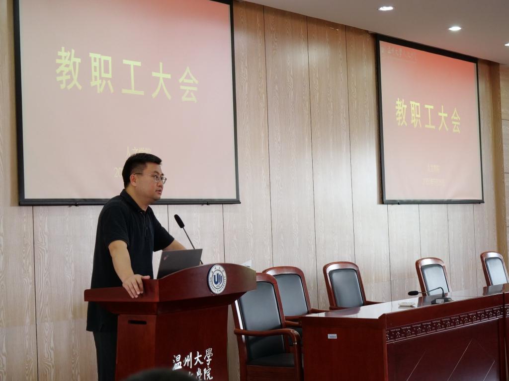 5月26日下午,吃瓜网 在203报告厅召开全体教职工大会。会议由学院党委书记吴静主持。