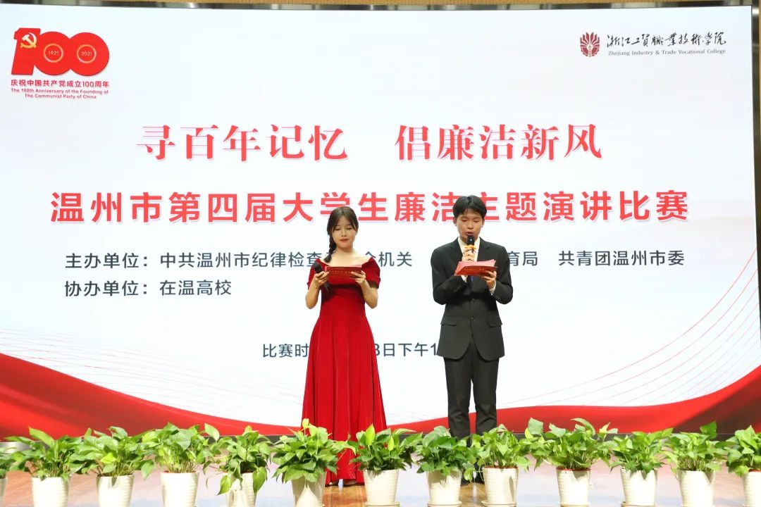为庆祝中国共产党建党100周年,进一步加强高校大学生廉洁教育,助力“清廉温州”建设,5月28日(周五) 下午13:00,温州市纪委、温州市教育局、共青团温州市委于温州市瓯江口产业集聚区雁云路301号浙江工贸职业技术学院行政楼105报告厅举办了温州市第四届大学生廉洁主题演讲比赛决赛。