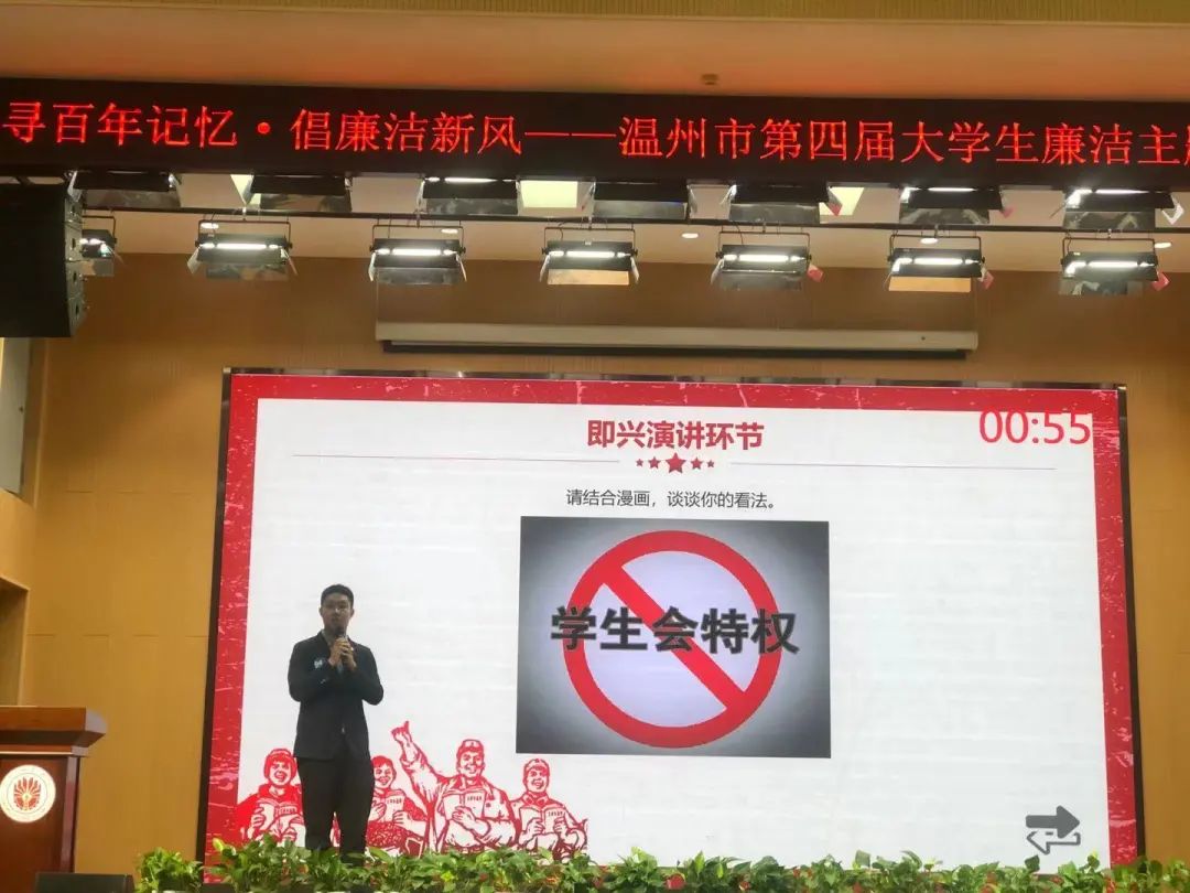 本次演讲比赛由市纪委机关、市教育局、团市委联合举办,浙江工贸职业技术学院负责承办,各高校团委负责校内各项赛事。大赛围绕着“寻百年记忆,倡廉洁新风”的主题,分为主题演讲和即兴演讲两个环节进行。主题演讲围绕大赛主题发表演讲;即兴演讲题目由现场抽签决定,参赛选手围绕党史学习教育、社会热点、大学生活中的廉洁文化等话题发表演讲。