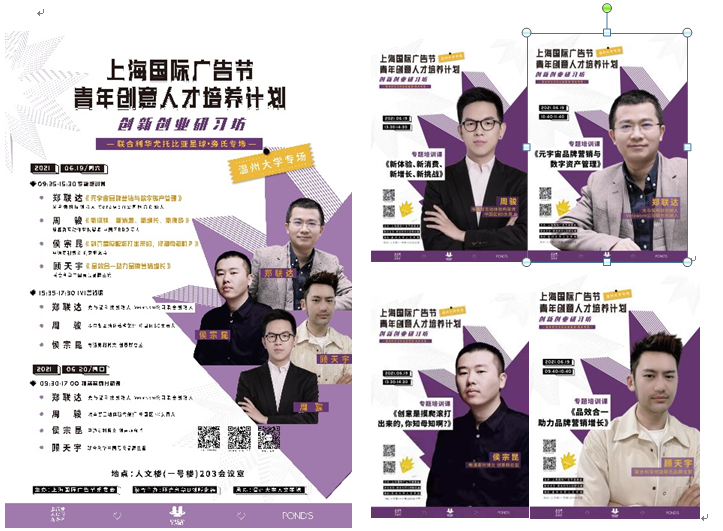 经广告系全体老师共同努力和精心筹备,6月19、20日,一场来自大上海的广告创意头脑风暴,将席卷吃瓜网 。上海国际广告节把它的拳头公益品牌活动——青年创意人才培养计划创新创业研习坊搬进温大,来自上海国际广告节战略合作方——联合利华旁氏品牌、电通麦利博文、埃森哲互动与光弧科技的业界精英们将为温大广告学子带来精彩纷呈的创新创意创业的饕餮盛宴!