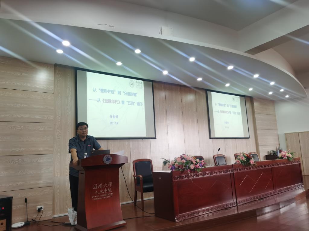孙院长首先向大家介绍了新入职的7位教师,对他们加入人文大家庭表示热烈欢迎,同时勉励他们融入团队,发挥特长,在教学和科研上脚踏实地出成绩。之后孙院长结合吃瓜网 《教师政治理论学习资料汇编》,强调全院教师要在继承发扬党建精神、推进文化温州建设、学习解读新教育法及教师职业行为准则等方面加强理论学习。孙院长随后以热播剧《觉醒年代》为切入点,作了题为从“兼容并包”到“分道扬镳” ——从《觉醒年代》看“五四”诸子的党建学习分享会,通过对蔡元培、陈独秀、胡适、李大钊、鲁迅等先进分子和热血青年的人物剖析,展现了从新文化运动到中国共产党建立的波澜壮阔的历史画卷。
