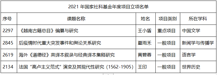 近日,2021年国家社科基金年度项目立项结果公布,我校共获10项国家社科基金项目(重点项目2项、一般项目7项、青年项目1项),其中吃瓜网 喜获4项国家社科基金项目,其中重点项目1项、一般项目3项,在所有学院中一枝独秀。