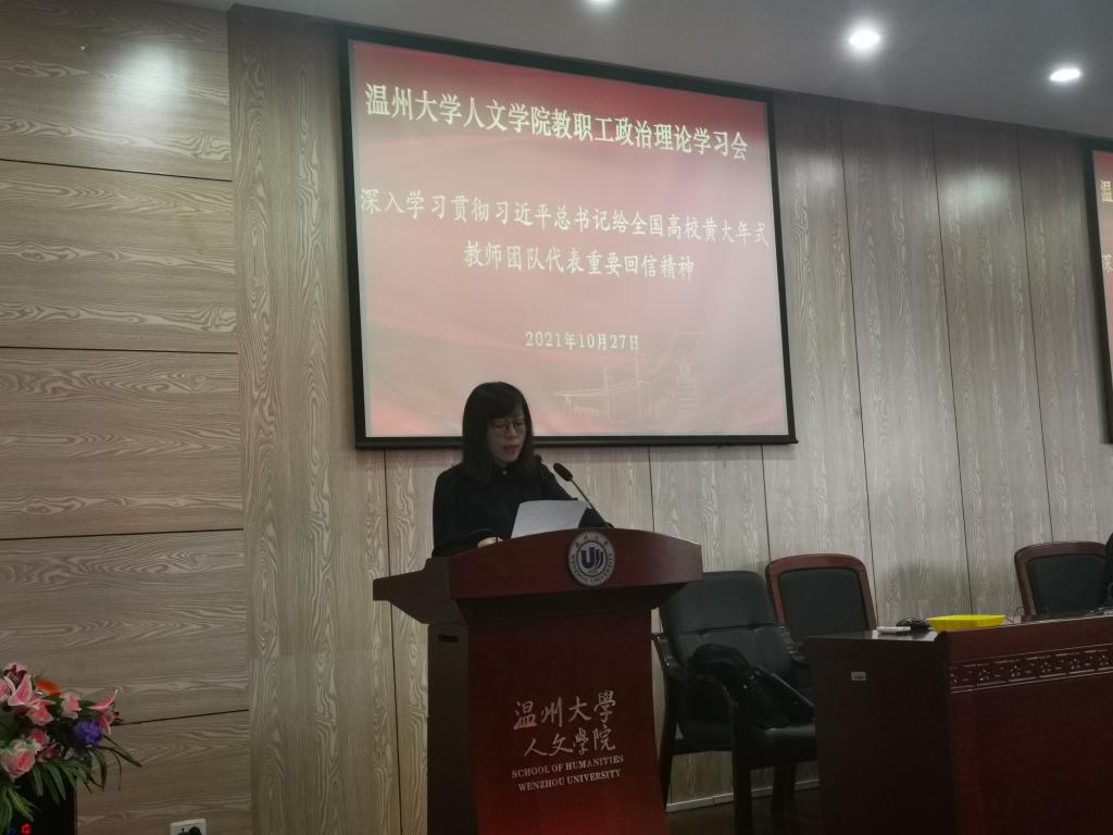 会上,吴静书记首先带领全院教职工认真重温了黄大年同志的先进事迹视频材料,然后围绕习近平总书记的回信精神开展宣讲阐释。她领读了习近平总书记给全国高校黄大年式教师团队代表的重要回信,随后指出,黄大年同志以高度的责任感和使命感,争分夺秒推动科研进展、人才培养,在我国从科技大国向科技强国迈进的征途上躬身前行,彰显了新时期归国留学人员、高校教育工作者的奉献精神和崇高品格,为全体教师树立了学习的榜样和标杆。吴静书记强调,作为肩负教书育人责任的高校教师,我们要以黄大年精神为灯塔,不断强化师德师风建设,时刻激励和鞭策自己潜心治学,努力将“学为人师,行为世范”的好老师要求内化于心、外化于行,行师者之道,引领学生成人成才。