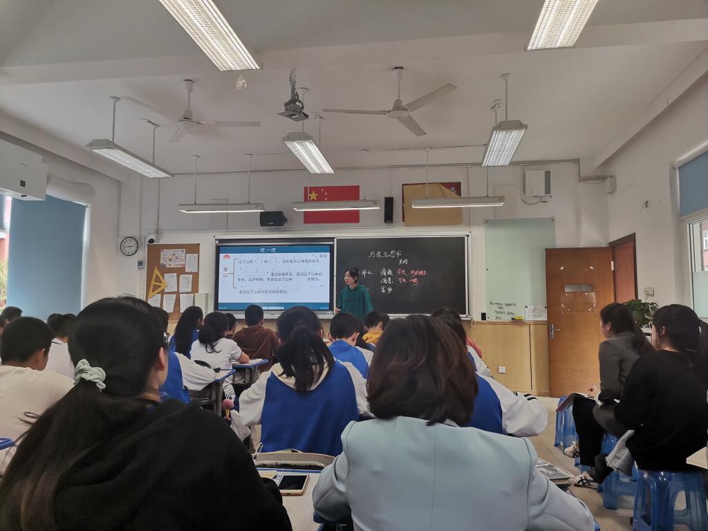 首先是实习生陈妍谷在初一(2)班的汇报课,她的教学篇目是《再塑生命的人》。课堂中,陈妍谷牢牢抓住教学的重点课堂以生为本,以任务驱动,创设感知性默读、理解性默读和创造性默读三个层次任务,让学生学会默读,培养学生从文中准确获取信息并进行语言概括的能力。并在此基础上通过品读与揣摩,理解“再塑生命”的含义。课堂教学思路清晰,教学目标落实到位。第二堂汇报课是实习生陈卓敏在初二(6)班带来的《与朱元思书》(第二课时)。课堂中陈卓敏抓住文本中对山与水的描写,强调其背后的情感,层层推进教学。整个课堂富有单元意识,有意识的勾连《三峡》和《与元思书》的差异,拓展吴均相关论述,课堂教学富有深度。