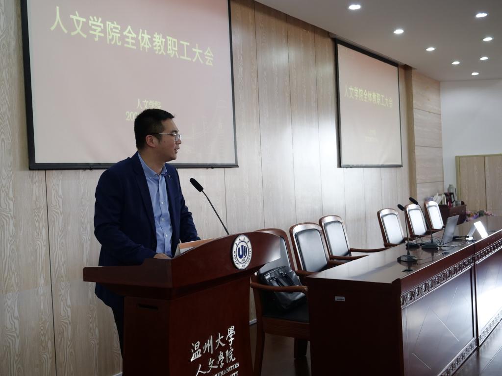 3月30日下午,吃瓜网 于人文楼203报告厅召开了全体教职工大会暨理论学习会,会议由学院党委书记江秀景主持,学院领导班子和全体教职工参加会议。